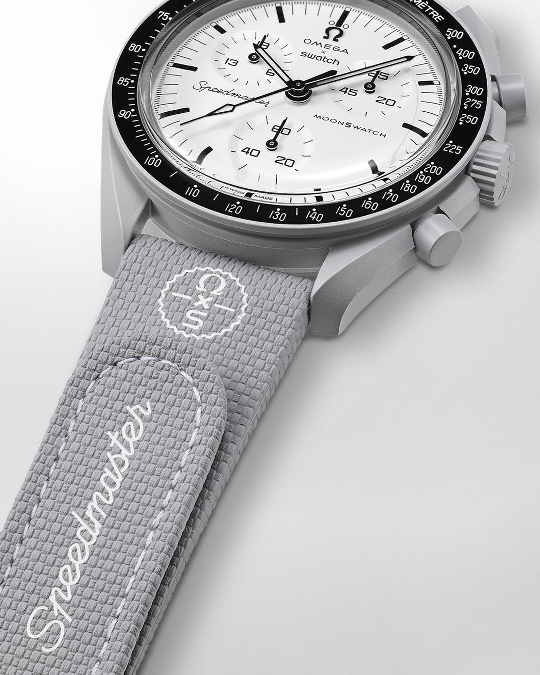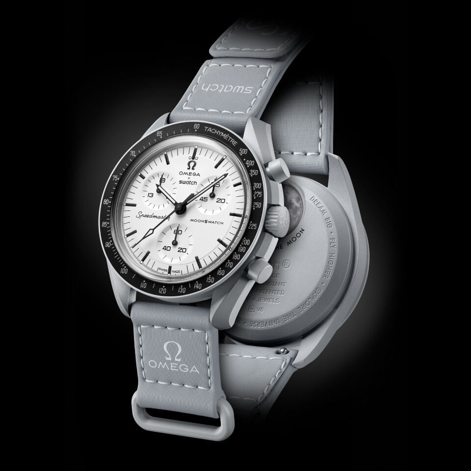 Este cronógrafo de edição limitada apresenta caixa, coroa e botões em Biocerâmica cinza, além de pulseira em VELCRO® cinza com costura contrastante em cinza claro e passador em Biocerâmica. Possui mostrador branco e bisel em Biocerâmica preta com escala taquimétrica branca. Este relógio apresenta dois contadores exclusivos às 10 e 2 horas. O primeiro indica o número 19 (normalmente 60) na parte superior, enquanto o outro exibe o número 65 (normalmente 10), em referência ao ano de 1965. Esses contadores foram calibrados para totalizar 19 horas (contador às 10 horas) e 65 minutos (contador às 2 horas), tornando a leitura do cronógrafo um pouco diferente dos cronógrafos típicos. Os números 19, 65 e 60 (no contador às 6 horas) brilham em azul sob luz ultravioleta, homenageando o OMEGA Speedmaster e a certificação de voo que recebeu da NASA há 60 anos, em 1965. Uma imagem da Lua pode ser encontrada na tampa da bateria. Os mostradores de todos os relógios desta coleção exibem a marca OMEGA X Swatch, o icônico logotipo Speedmaster e o logotipo MoonSwatch. Comuns a todos os modelos são a construção em vidro biocerâmico em formato de caixa, o "S" gravado no centro do vidro, em referência ao logotipo Swatch, o padrão circular fino e sofisticado no anel externo do mostrador e os submostradores embutidos, as asas com design preciso e suave e, claro, a sensação única da Biocerâmica. Os marcadores de horas, os ponteiros de horas e minutos e a ponta do ponteiro de segundos do cronógrafo são revestidos com Super-LumiNova® de grau A para um brilho perfeito no escuro (emissão verde).